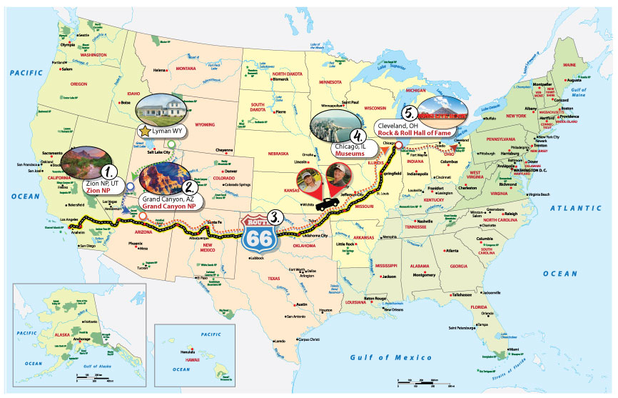 Mom and Dad begin their cross-country adventure, leaving Lyman, Wyoming, and driving to Zion National Park, Utah, then scooching down into Arizona and experiencing the Grand Canyon.
